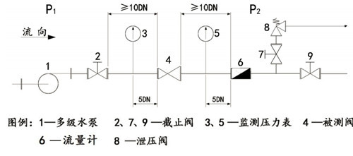 如圖所示:4位置活塞式減壓閥, 分別為ZJY46H-25C DN450活塞式減壓閥;壓力表(P1、P2)精度為0.4級,并具有穩(wěn)流管和旋塞調(diào)節(jié)閥;測流流量計為電磁式或超聲波式均可,安裝于被測閥4后的規(guī)定位置。