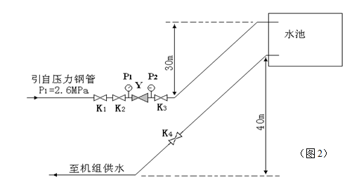 如圖2所示:在壓力鋼管進(jìn)機(jī)組處的位置附近取水。K1、K2分別這取水閥和工作閥,Y為ZJY46H-40C DN150減壓閥。P2的壓力整定為0.6MPa,減壓后的水直供水池,再由水池供兩臺機(jī)組用水。調(diào)節(jié)閥門K3為合適的過流面積。改進(jìn)前的單臺ZJY46H-40C DN150減壓閥的流量在滿足兩臺機(jī)組運行時,運行噪音為118dB。