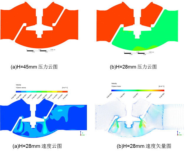 分別試算H= 45mm、35mm、30mm、29mm、28mm、27mm六種閥芯開度并比較計算結(jié)果,得出在H=28mm時,ZJY46H活塞式減壓閥出口壓力約為0.6MPa,因此適于給定的水電站技術(shù)供水系統(tǒng)的ZJY46H活塞式減壓閥的開度應(yīng)為28mm。