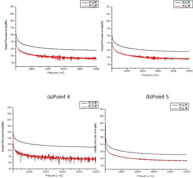 優(yōu)化前后的減壓閥有相同趨勢的聲壓級圖,優(yōu)化節(jié)流錐型線后的減壓閥聲壓級平均下降了20dB以上,并且優(yōu)化后的減壓閥聲壓級脈動性較未優(yōu)化明顯,達(dá)到一定的減噪要求。