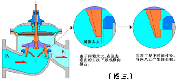 4.2.2導向爪與閥座的間隙太大(總間隙1mm)。因此,當紊流產生時形成導向爪與閥座之間的相互撞擊。由于導向爪為銅材質、閥座為不銹鋼材質,工作時間一長,在導向爪上形成撞擊痕跡。如圖三所示