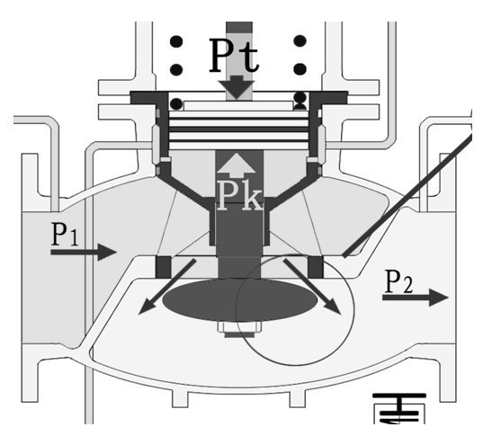 當P1上升時,減壓閥的P2+ΔP2首先表現為上升,其值通過反饋系統出口管傳到控制閥,使Pt′+ΔPt′,ΔPt′與Pk′的力達到新的平衡,控制閥h減小;相應ΔPk′壓力增大,經壓力導管,使主閥的Pk+ΔPk,Pt=Pk+ΔPk壓力達到新的平衡,主閥h減小、ΔP2值恢復為原P2值。當進口壓力P1下降時,主閥與控制閥的工況則與上述的工況相反。