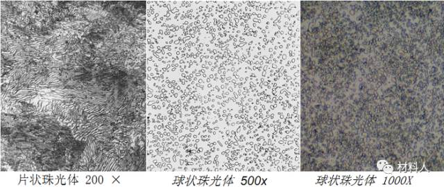 (2)球狀珠光體:經(jīng)球化退火獲得,滲碳體成球粒狀分布在鐵素體基體上;滲碳體球粒大小,取決于球化退火工藝,特別是冷卻速度。球狀珠光體可分為粗球狀、球狀、細(xì)球狀和點狀四種珠光體。